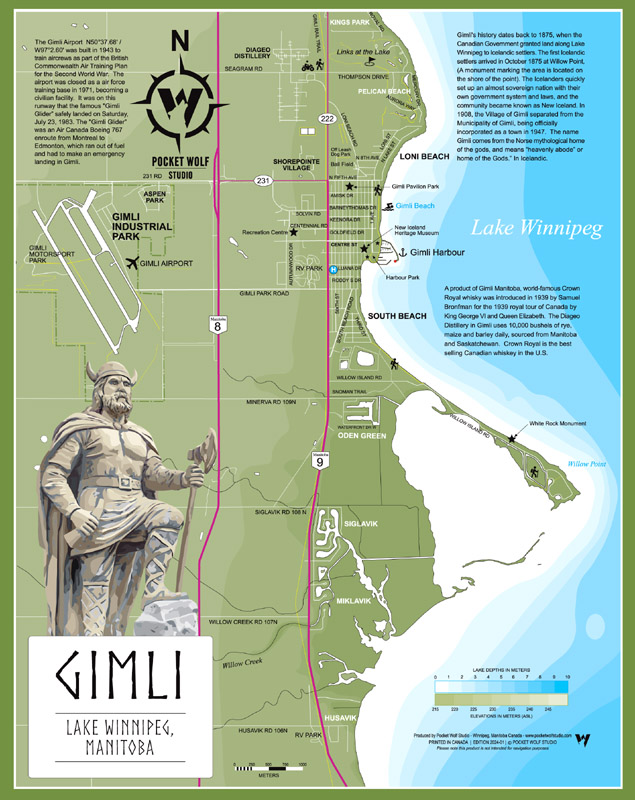 Lake Winnipeg, Gimli Beach area includes drawing of Gimli Viking Statue
