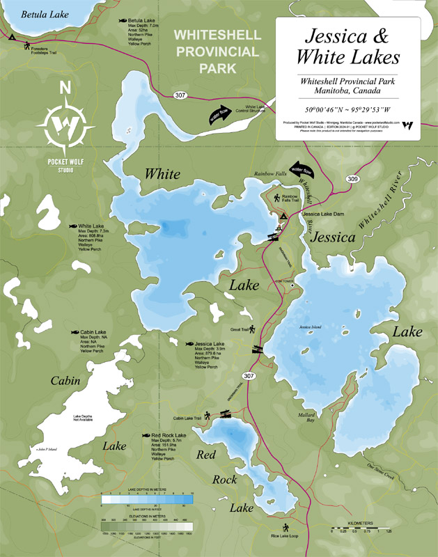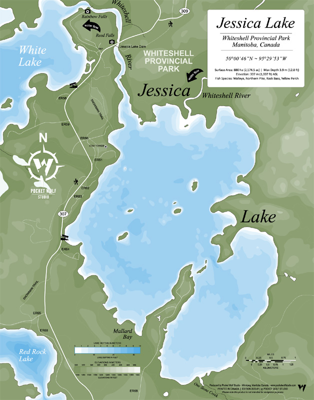 Whiteshell Provincial Park, includes depths and physical features for Jessica, Red Rock and White Lakes