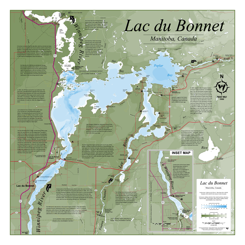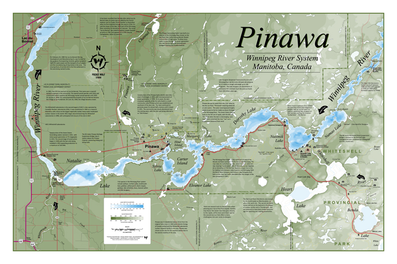 Pinawa area including the Winnipeg River from Slave Falls in the east to the town of Lac Du Bonnet in the west. The map includes physical features and depths for this portion of the Winnipeg River system.