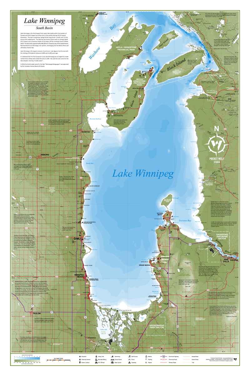 South portion of Lake Winnipeg from Selkirk and Red River in the south to Hecla – Grindstone Provincial Park in the north. Includes depths and physical features